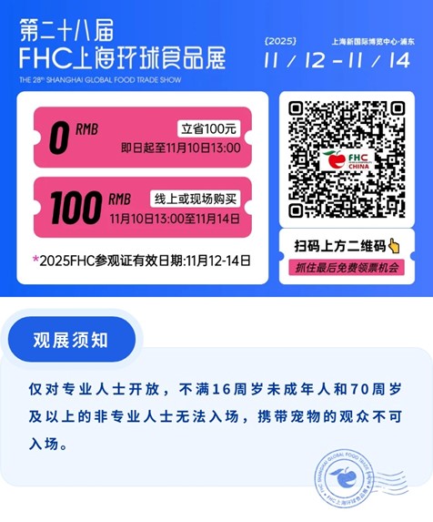 2025FHC专业论坛 “食”力破局,引爆品牌高效增长——飞瓜食品电商实战论坛 与“食”俱进·“饮”领未来——2025食饮电商新增长峰会暨渠道买手论坛 SCCF超级可可&巧克力产业论坛 公平田野-大地母亲Talk 拥抱变革 共创餐饮业未来论坛 餐饮私域运营及创新增长论坛 破局12539;共生2025FHC国际肉类高峰论坛 2025第六届外卖产业生态大会 2025心力·践行:第22届中华餐饮双创论坛 2025中欧地理标志及区域品牌发展国际论坛 2025冻品产业新生态发展论坛暨中冷院华东分院换届大会 2025中国智慧餐厨·炒菜机器人生态大会 聚势·跃升——2025SFE连锁加盟秋季峰会 2025中餐全球化发展论坛暨RFF首届全球智能餐食机器人创新大会 2025年中国罐头工业协会年会暨六届四次理事扩大会议 五、 聚焦专业观众需求:倒计时开启,免费领票通道即将关闭! 距离2025FHC上海环球食品展开展已不足30天,专业观众免费领票通道将于11月10日中午13:00正式关闭,现场购买参观证需支付100元! 目前,展会各项筹备工作已进入最后冲刺阶段,21国际展团陆续抵达上海,5500㎡核心展区的搭建工作即将启动,8大同期展、10余场赛事、20余场论坛的已蓄势待发!抓紧时间扫描下方二维码,免费领取专业观众参观证,11月12日-14日上海新国际博览中心,与全球优质企业面对面交流,挖掘万亿商机,开启食饮合作新篇章!逾期未领票的观众,将无法享受展会各项专属服务与优惠政策,切勿错过!