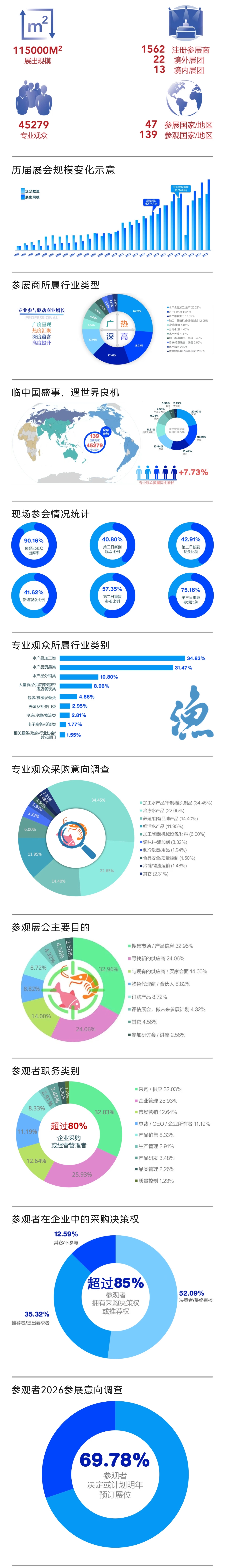 第28届中国国际渔业博览会和中国国际水产养殖展览会数据报告感谢您参加第28届中国国际渔业博览会和中国国际水产养殖展览会!来自全球139个国家和地区的45279名专业买家参加了本届展会,与47个国家和地区的1562家注册展商进行了现场面对面的交流。本届渔博会的国际影响力持续扩大,辐射范围超越往届。除了来自传统欧美市场的资深买家依旧保持高度热情外,更多来自东南亚、中东、非洲等区域的专业采购商纷至沓来,他们的活跃参与,印证了渔博会作为全球水产行业贸易核心的地位日益巩固。 渔博会的成功基植于其极高的专业性,现场汇聚了全球范围内的顶级专业买家与资深行业仕英,他们的深度参与,确保了交流的深度与合作的精准。与此同时,行业最为前沿的动态信息在此汇聚、碰撞与传递——从市场趋势、消费洞察到科技创新,这些信息极大地帮助了全球水产品生产商和加工商进行精准的产品研发与战略性的市场拓广,为他们应对瞬息万变的市场提供了关键决策支持。 渔博会“商圈”的持续扩容,标志着真正全球化、多元化的供应链网络正在此高效对接与深拓。它展现出全球海产行业一个强大的商业枢纽中心的吸引力,驱动着全球供应链网络的完善与深度融合。 面对全球市场的快速变化,渔博会成为了高端水产食材新品的最佳展现平台。从可持续捕捞的海产到高科技养殖的珍品,从便捷的加工食品到顶级的餐桌食材及配料、琳琅满目的创新产品,展现了参与者应需而变,聚势成新的卓越全球资源整合实力和紧跟市场的应变创新能力,他们通过渔博会这一高效平台,成功实现了从源头捕捞、生产加工到终端零售与量级采购的链接,彰显了全球水产供应链日益完善的协同效率与整合智慧。