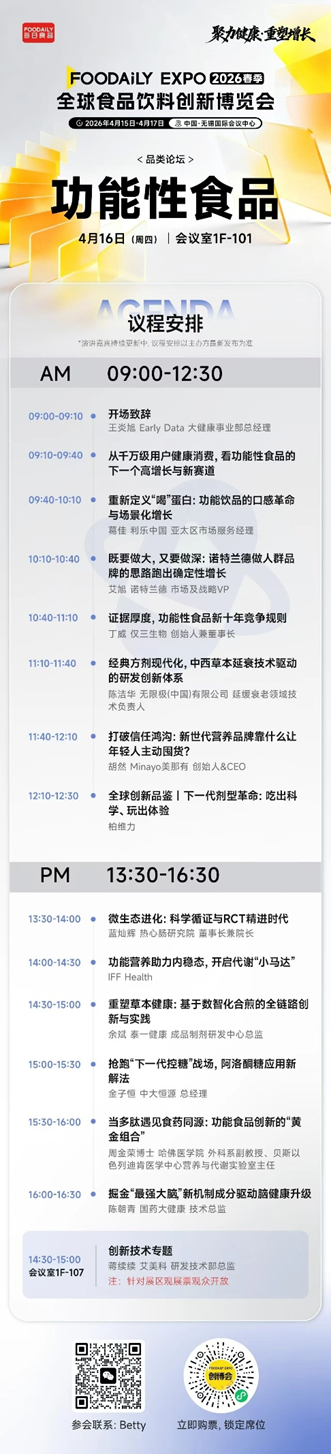 【功能性食品】品类论坛 当健康从被动调理走向主动管理,功能性食品正进入一个全新的增长周期。成分创新、科学循证与剂型体验的全面升级,正在重塑行业竞争规则——消费者不仅关注吃什么,更在意“有没有效、可不可信、愿不愿意长期吃”。 在2026 Foodaily创新博览会的功能性食品品类论坛,我们将深度探讨行业前沿创新:从微生态循证研究、代谢健康与脑力营养等核心方向,到麦角硫因、阿洛酮糖、多肽等新机制成分突破;从高蛋白功能饮品、中西草本现代化研发到下一代剂型革命,系统解析功能食品从科学研究到产品落地的关键路径。